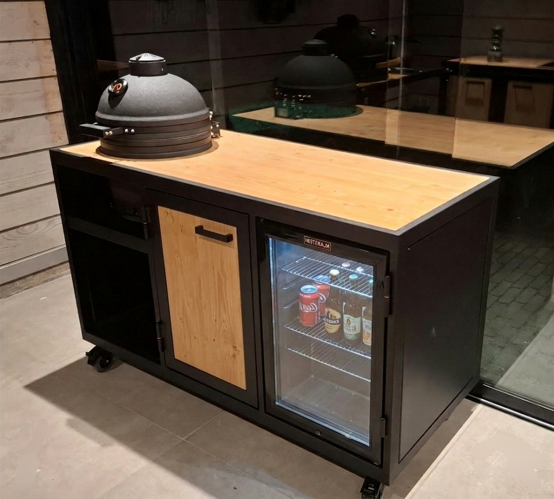Direct leverbaar!Compleet meubel met kamado Urban chef compact deluxe, kast voor opbergen van je kookgerei en een Klarstein koelkast.Alles in één compact meubel!!148x93x66.5 LxHxDVervaardigd uit staal en douglas!